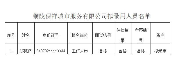 根據(jù)《銅陵保祥城市服務有限公司招聘公告》規(guī)定,經(jīng)過報名、面試、體檢、考察等環(huán)節(jié),現(xiàn)將擬錄用人員公示如下(見附件)。