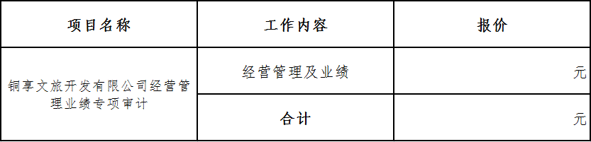 針對(duì)貴公司對(duì)銅享文旅開發(fā)有限公司經(jīng)營(yíng)管理業(yè)績(jī)專項(xiàng)審計(jì),我所報(bào)價(jià)如下: